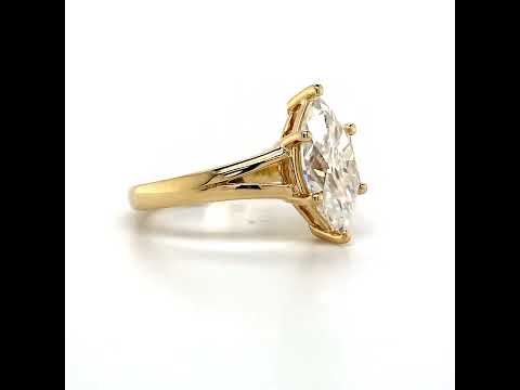 This beautiful engagement ring features a split shank design with a marquise cut Moissanite center stone, set in your choice of 14k gold, 18k gold or platinum.