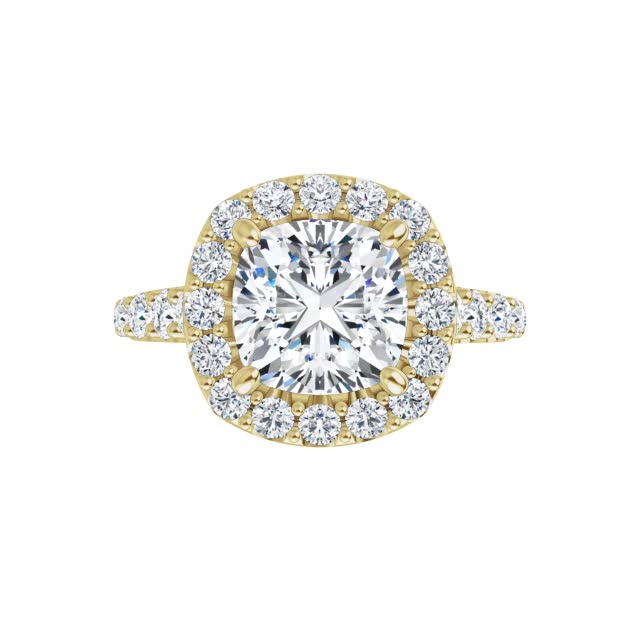 This beautiful engagement ring features a cathedral and a halo design with a cushion cut colorless Moissanite center stone and 0.85ct of VS, colorless diamond side stones, set in your choice of 14k gold, 18k gold or platinum. Add the optional band to make it a complete wedding set.