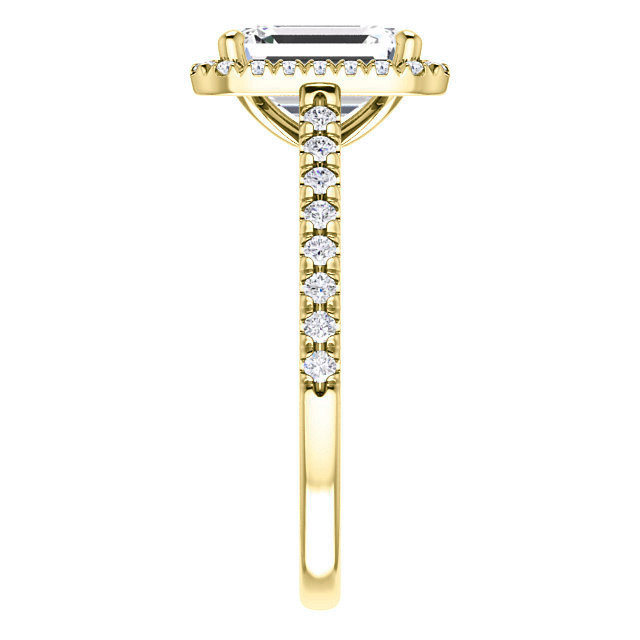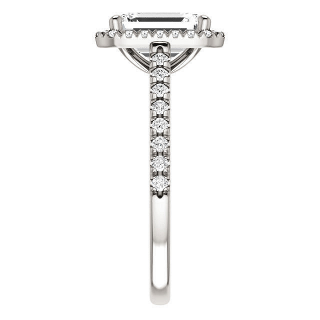This beautiful engagement ring features a cathedral halo design with an emerald or radiant cut Moissanite center stone and 0.37ct of VS, colorless diamond side stones, set in your choice of 14k gold, 18k gold or platinum. Add the optional band to make it a complete wedding set.