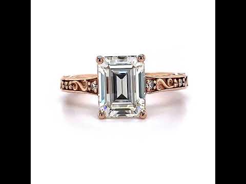 This beautiful engagement ring features a Floral and Cathedral design with an Emerald or Radiant cut Moissanite center stone and 0.06ct of Moissanite side stones, set in your choice of 14k gold, 18k gold or platinum. Add the optional band to make it a complete wedding set.