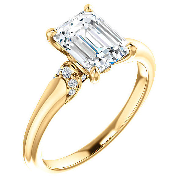 This beautiful engagement ring features a Three-Stone design with an Emerald or Radiant cut Moissanite center stone and 0.10ct of round brilliant colorless Moissanite side stones, set in your choice of 14k gold, 18k gold or platinum. Add the optional band to make it a complete wedding set.