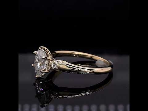 This beautiful engagement ring features a Three-Stone design with an Oval cut Moissanite center stone and 0.12ct of round brilliant colorless Moissanite side stones, set in your choice of 14k gold, 18k gold or platinum. Add the optional band to make it a complete wedding set.