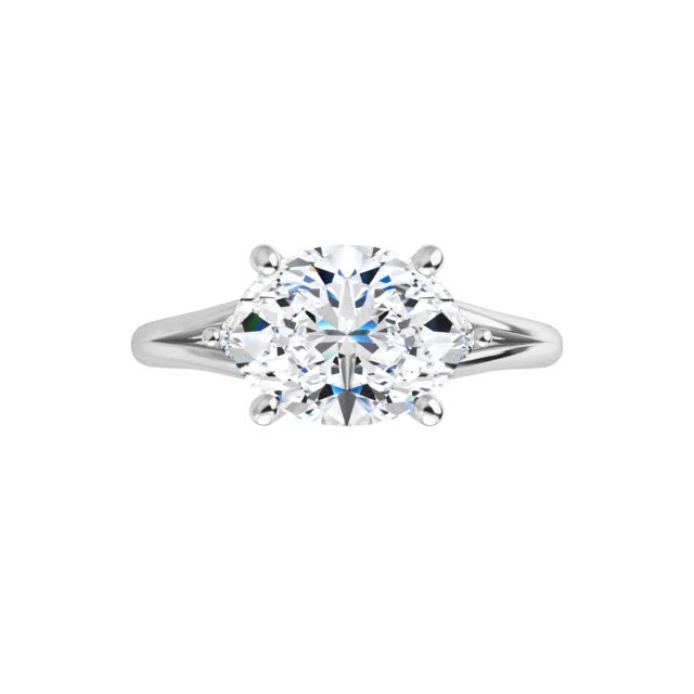 This beautiful engagement ring features a unique East-West design, an Oval cut colorless Moissanite center stone, and is set in 14k gold, 18k gold or platinum. The side stone carat weight is 0.06cts and is available in round brilliant colorless Moissanite side stones.