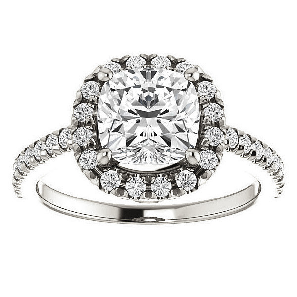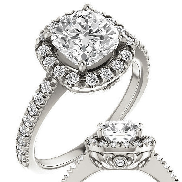 This beautiful engagement ring features a lovely halo design, a Cushion cut colorless Moissanite center stone, and is set in 14k gold, 18k gold or platinum. The combined carat weight of the round Moissanite side stones is 0.60ct.