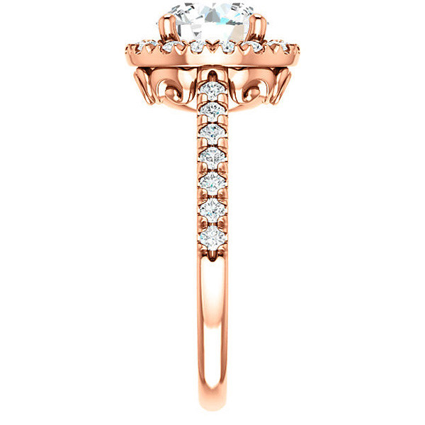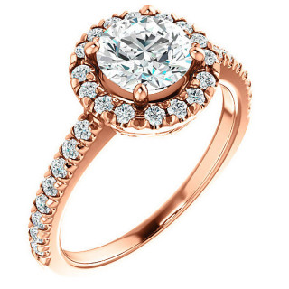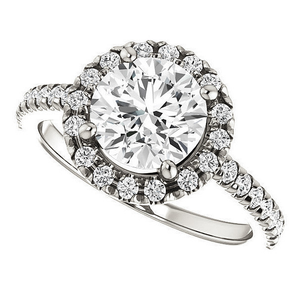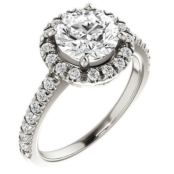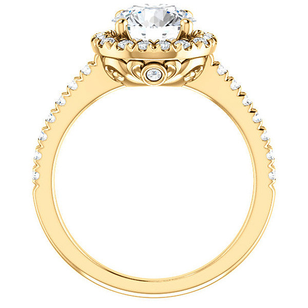 This beautiful engagement ring features a lovely halo design, a Round cut colorless Moissanite center stone, and is set in 14k gold, 18k gold or platinum. The combined carat weight of the round Moissanite side stones is 0.60ct.