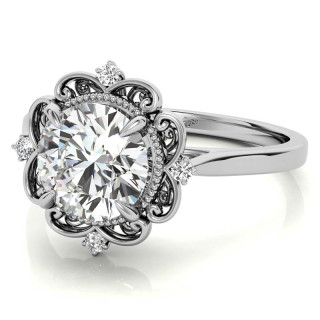 This beautiful engagement ring features a lovely halo design, a round brilliant cut colorless Moissanite center stone, and is set in 14k gold, 18k gold or platinum. The combined carat weight of the round Moissanite side stones is 0.45ct. The band width is 2.0mm.