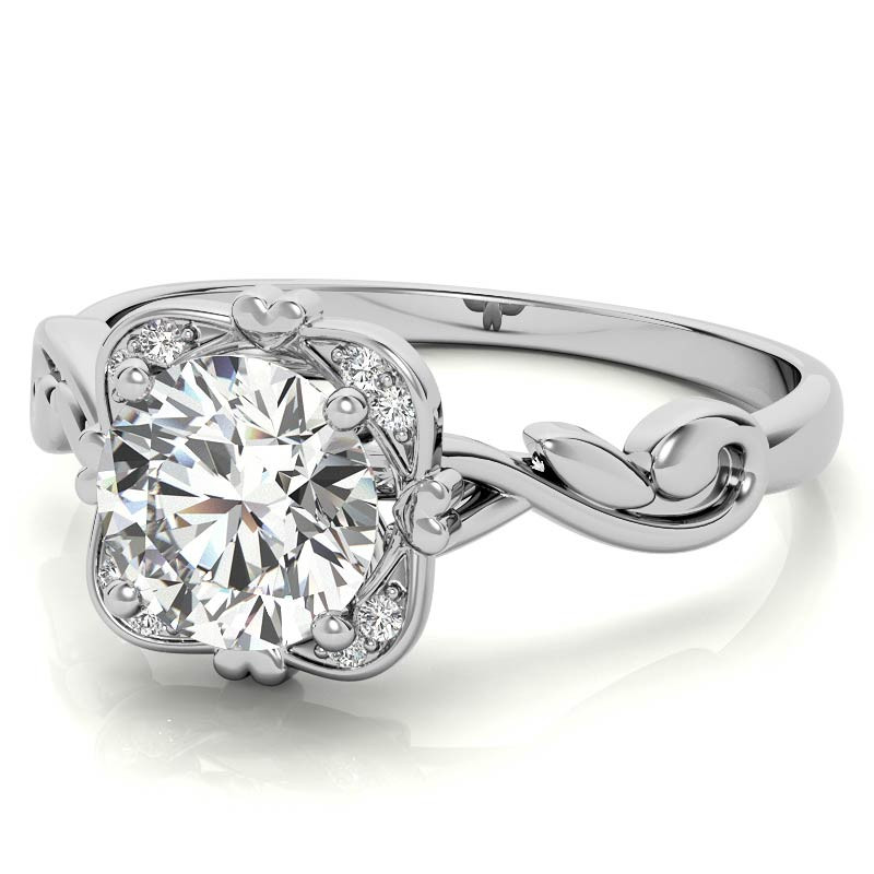 This exquisite engagement ring boasts a captivating round brilliant Moissanite center stone, encircled by a stunning floral halo adorned with both round accent stones and intricate heart-shaped detailing. The band features an elegant floral motif with petal-shaped scroll accents, lending a delicate and feminine touch to the design. The cathedral setting of the ring showcases a unique heart-shaped metal accent directly under the center stone, adding a touch of romance and charm to the overall look.