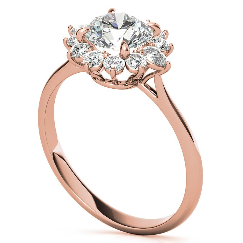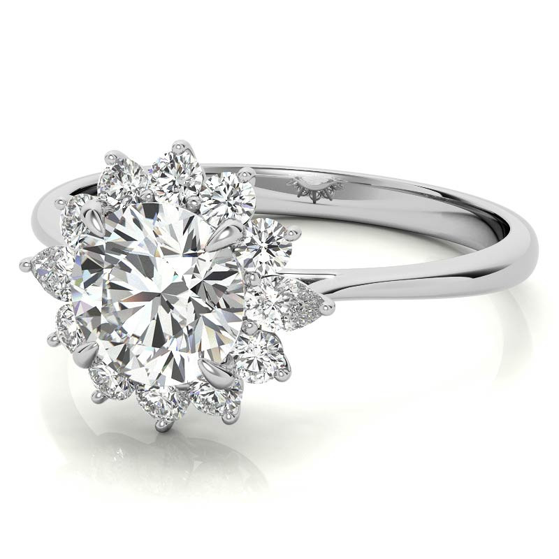 Held in place by four claw-shaped prongs, the center stone sits high in the basket, creating an eye-catching focal point. The halo itself is crafted with 2mm/0.03ct round brilliant and 3x2mm/0.08ct pear-cut diamond side stones, totaling 0.46ct in carat weight.