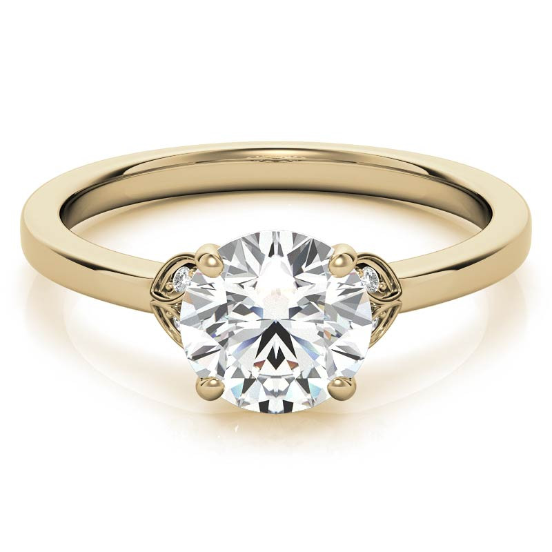 This exquisite solitaire engagement ring showcases a low-set cathedral design, highlighting a round brilliant Moissanite center stone that you can personalize in both size and brand. Enhancing the allure of the centerpiece, delicate petal-shaped accents adorn all four sides of the center stone, featuring round brilliant Moissanite side stones that contribute to a combined total carat weight ranging from 0.04ct to 0.08ct, contingent on your chosen center stone size, creating a stunning floral motif.