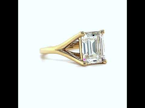 This beautiful Moissanite solitaire ring features a split shank design in a cathedral setting, an emerald or radiant cut colorless Moissanite center stone, and is set in your choice of 14k gold, 18k gold or platinum. Add the optional matching band to make it a complete bridal set.