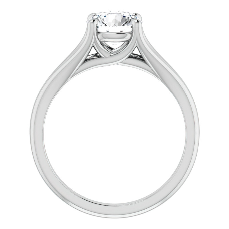 This exquisite cathedral engagement ring exudes sophistication with its classic solitaire design and split shank leading up to a round brilliant Moissanite center stone. The center stone can be tailored to your preferred size and quality.