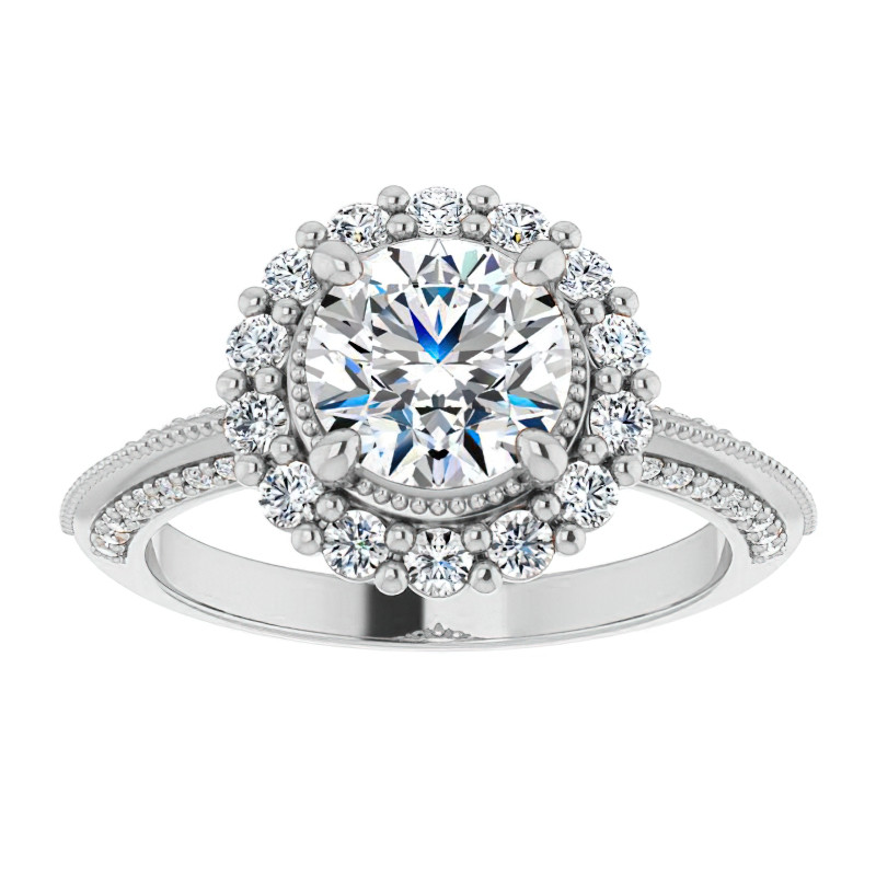 #enr446 Antique Style Round Halo Moissanite Engagement Ring with Milgrain