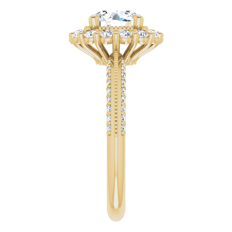 Elevate your engagement with this stunning Moissanite ring, featuring a beautiful halo of round accent stones encircling a round brilliant Moissanite center stone in the size and quality of your preference.