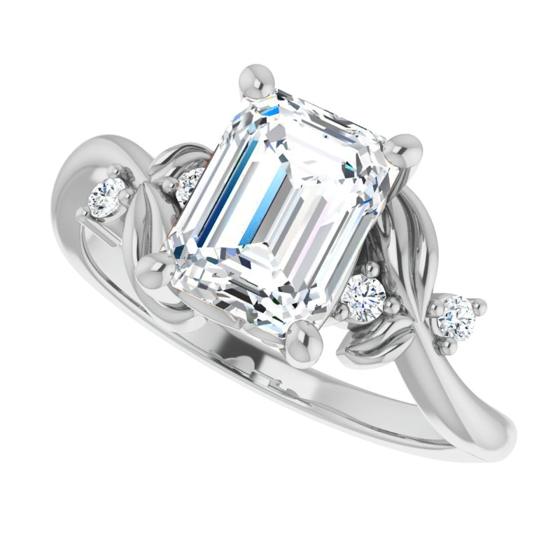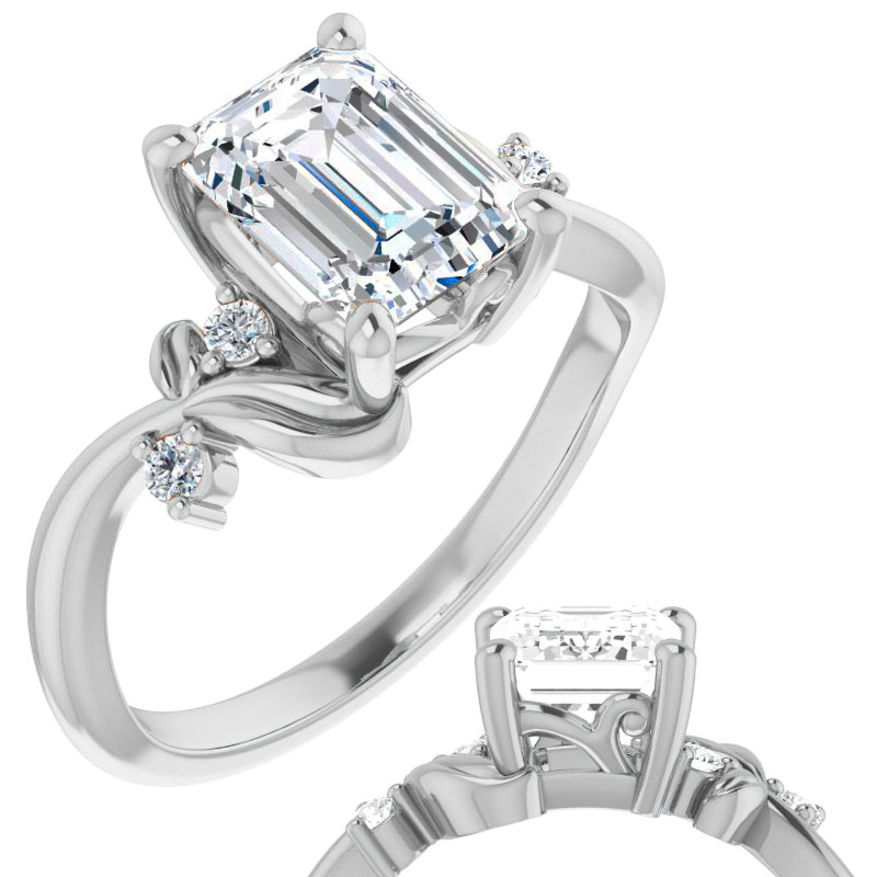 The captivating emerald or radiant cut Moissanite gemstone is held securely in place by the setting, which can be tailored to your desired size and quality. The combined carat weight of Moissanite accent stones is 0.08ct - 0.12ct.