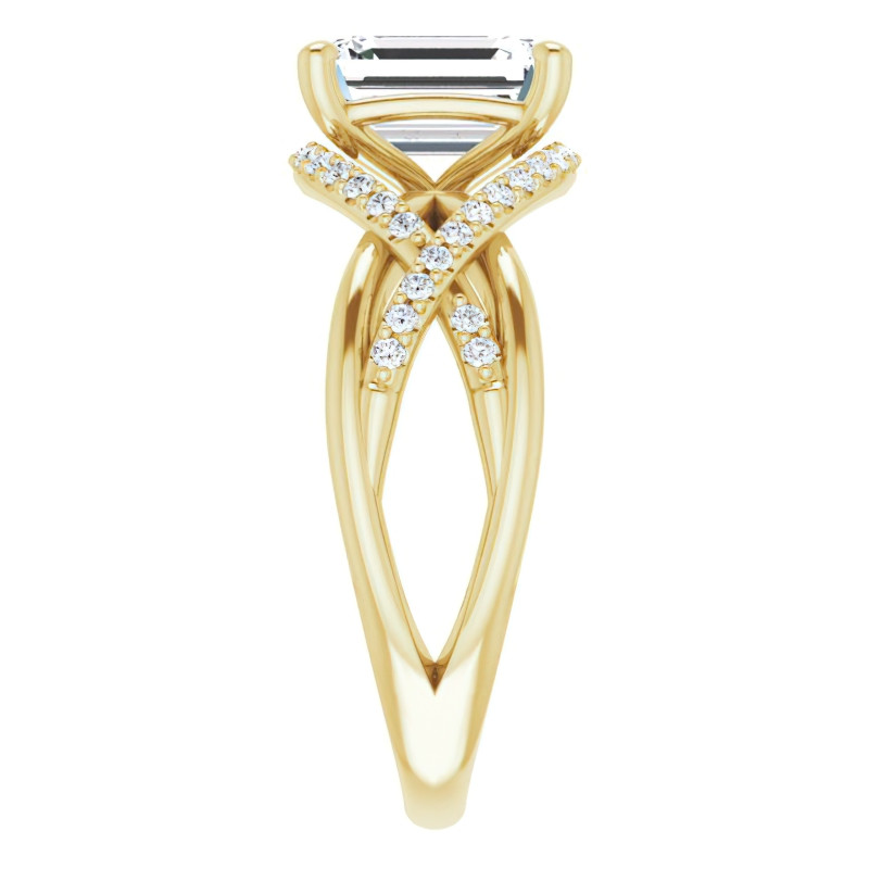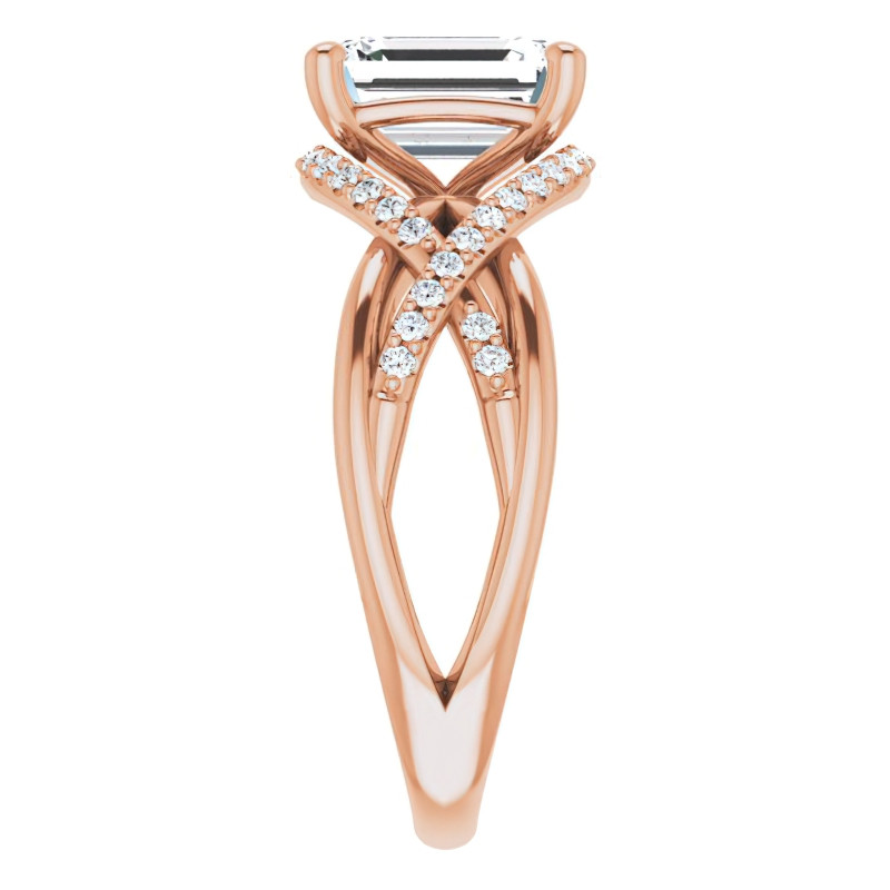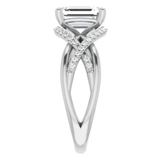 This engagement ring is a true masterpiece of design, with its multi-band style composed of four splits in the shank. The two plain splits elegantly weave together towards the center stone, while the other two feature a stunning infinity design, adorned with round brilliant cut Moissanite accent stones (0.19ct - 0.29ct) that gracefully encircle the emerald or radiant cut Moissanite center stone.