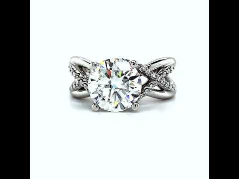 This engagement ring is a true masterpiece of design, with its multi-band style composed of four splits in the shank. The two plain splits elegantly weave together towards the center stone, while the other two feature a stunning infinity design, adorned with round brilliant cut Moissanite accent stones (0.19ct - 0.29ct) that gracefully encircle the round brilliant Moissanite center stone.