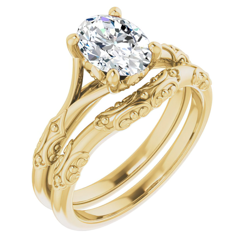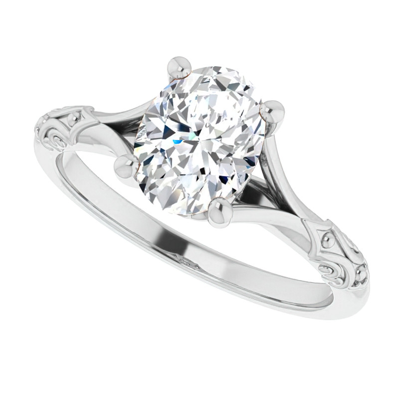 This cathedral engagement ring is a true showstopper, featuring an oval cut Moissanite center stone of your choosing, held securely in place by six elegant prongs. The band design exudes antique charm with its hand-engraved scroll detailing, creating a beautiful and unique piece that is sure to catch the eye.
