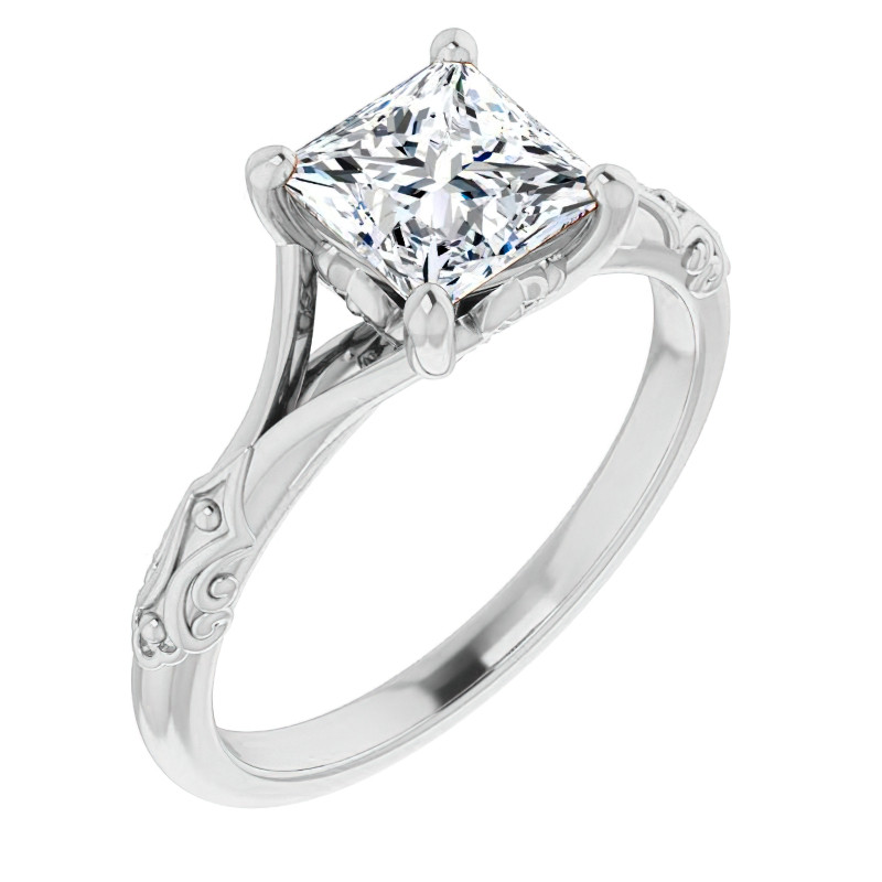 This cathedral engagement ring is a true showstopper, featuring a princess cut Moissanite center stone of your choosing, held securely in place by six elegant prongs. The band design exudes antique charm with its hand-engraved scroll detailing, creating a beautiful and unique piece that is sure to catch the eye.