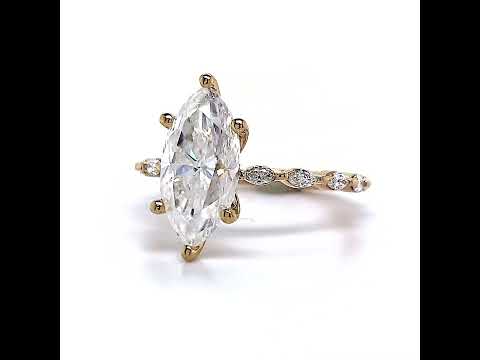 At its core, this captivating ring showcases a singular prong design, a testament to its minimalist beauty. Accentuating the center stage is a radiant array of ten 3x1.5mm marquise-cut VS/E diamonds, each boasting a 0.04ct weight, resulting in a combined total carat weight of 0.40tcw. This ensemble of diamonds adds a brilliant symphony of sparkle and sophistication to your cherished piece.