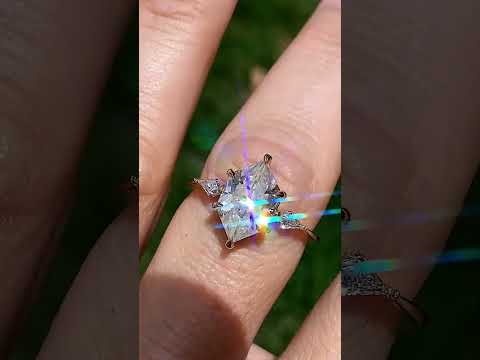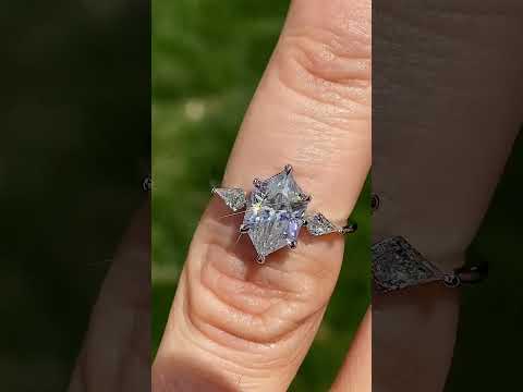 Behold this exquisite Moissanite engagement ring, a true symbol of timeless elegance. Picture a 3-stone setting, the centerpiece adorned with a dazzling duchess marquise cut Moissanite, a gem of your preferred size, cradled by six graceful claw-shaped prongs. It's flanked by two equally splendid 5x2.5mm kite-cut diamond side stones, adding a touch of brilliance to this masterpiece.