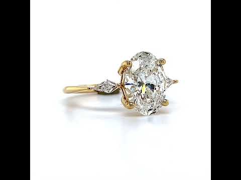 Behold this exquisite Moissanite engagement ring, a true symbol of timeless elegance. Picture a 3-stone setting, the centerpiece adorned with a dazzling oval cut Moissanite, a gem of your preferred size, cradled by six graceful claw-shaped prongs. It's flanked by two equally splendid 5x2.5mm kite-cut diamond side stones, adding a touch of brilliance to this masterpiece.