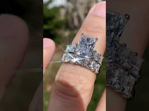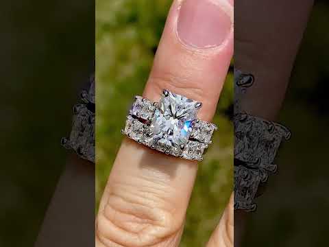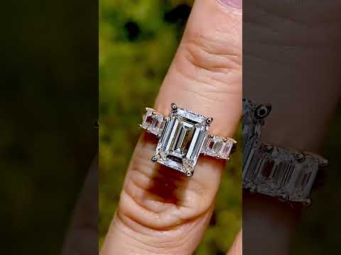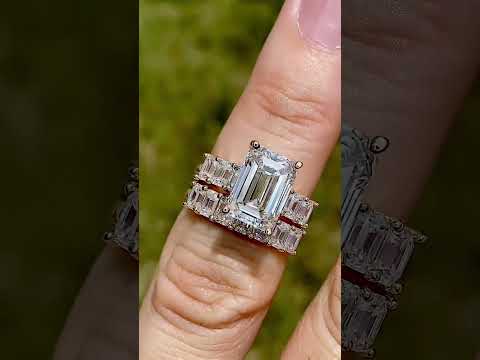 This captivating design features six 4x3mm/0.20ct emerald or radiant-cut accent stones thoughtfully integrated into the band, creating an enchanting symphony of sparkle. At its heart, the ring showcases an emerald or radiant-cut Moissanite center stone, tailored to your desired size and quality specifications.