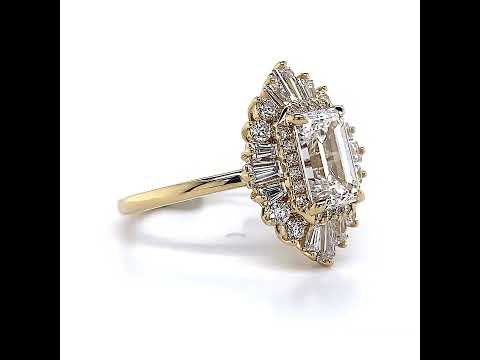 Discover the awe-inspiring beauty of our art deco-inspired ring, meticulously crafted to showcase every detail. With its captivating design, this ring boasts an emerald or radiant cut Moissanite center stone, which shimmers with radiance and brilliance. The center stone is surrounded by a double halo, intricately adorned with a total of 0.80ct of baguette and round brilliant diamonds, meticulously arranged to create a stunning display of light and sparkle.