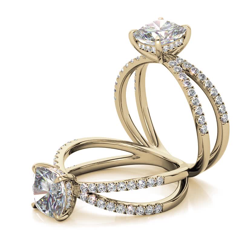 This beautiful engagement ring makes a powerful statement with a stunning split shank design, adorned with round brilliant cut Moissanite side stones that lead up to a hidden halo embracing the cushion cut Moissanite center stone.