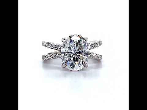 This beautiful engagement ring makes a powerful statement with a stunning split shank design, adorned with round brilliant cut Moissanite side stones that lead up to a hidden halo embracing the oval cut Moissanite center stone.