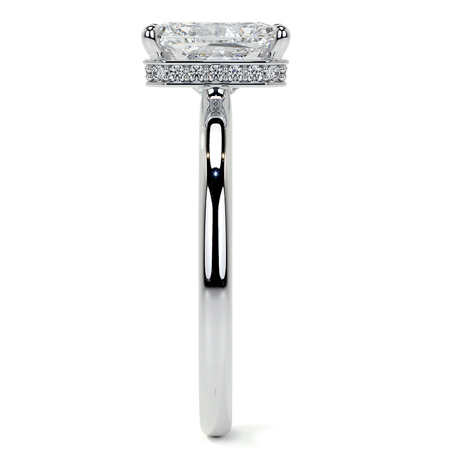 As an additional touch of brilliance, our ring features a hidden halo of round brilliant cut Moissanite side stones, beautifully accentuating the centerpiece and adding to its overall radiance.