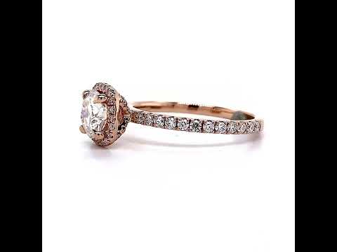Featuring a sophisticated cushion shaped halo design, the round center stone is delicately surrounded by stones under the prongs, extending down the band past half-way down the shank for a truly luxurious appearance. We offer this beautiful ring in your choice of 14k gold, 18k gold, or platinum to meet your individual preferences and style.