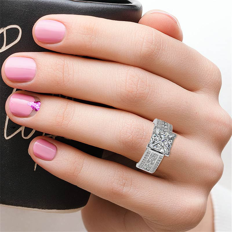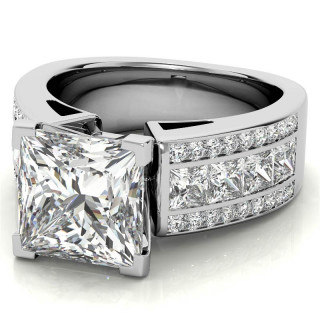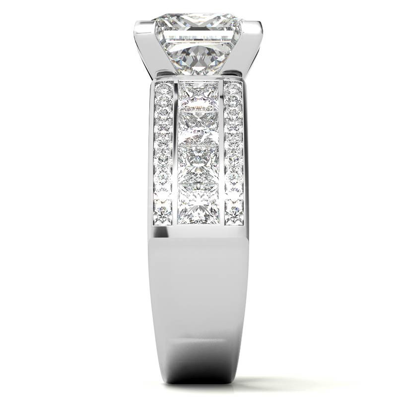 This piece also features an exquisite combination of princess and round brilliant Moissanite channel set side stones, totaling 1.64ct, radiating a breathtaking brilliance and allure.