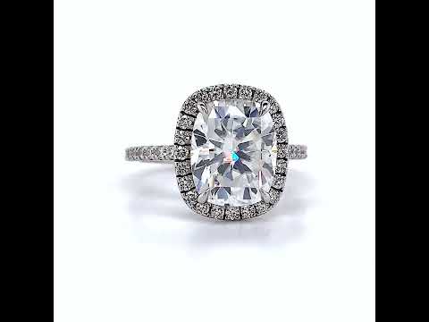 This beautiful ring features a delicate petite halo design, with stones set in the top of the halo, down the prongs, and around the base of the center stone, creating a stunning display of brilliance and sparkle. The rectangular cushion cut Moissanite center stone is a true statement of elegance, radiating with unparalleled beauty.