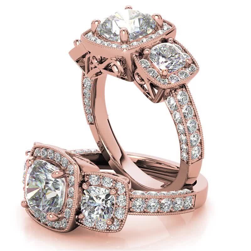 #enr660 Cushion Moissanite 3-Stone Halo Engagement Ring with Milgrain Accent