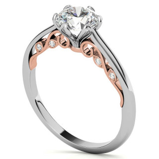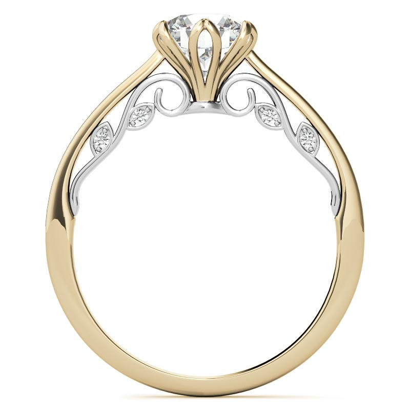 This beautiful Moissanite engagement features a petite tulip setting and floral design, a colorless round brilliant Moissanite center stone, and 0.04ct of round brilliant Moissanite side stones. Available in 14k two-toned gold. The band width is 1.8mm.