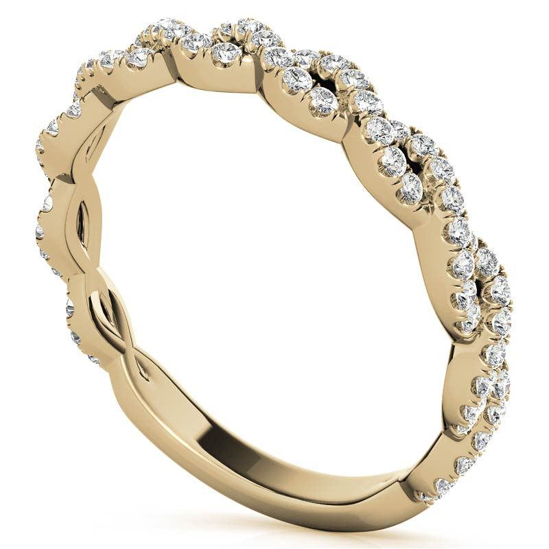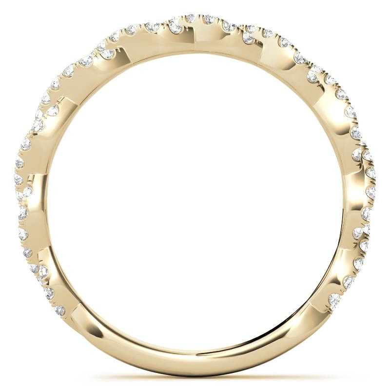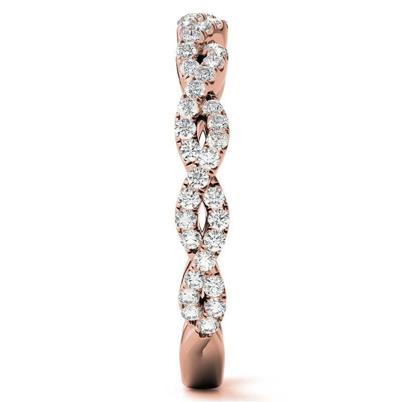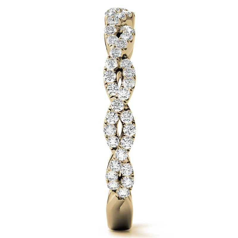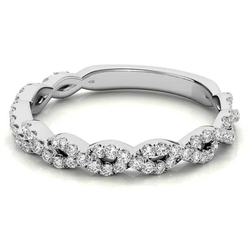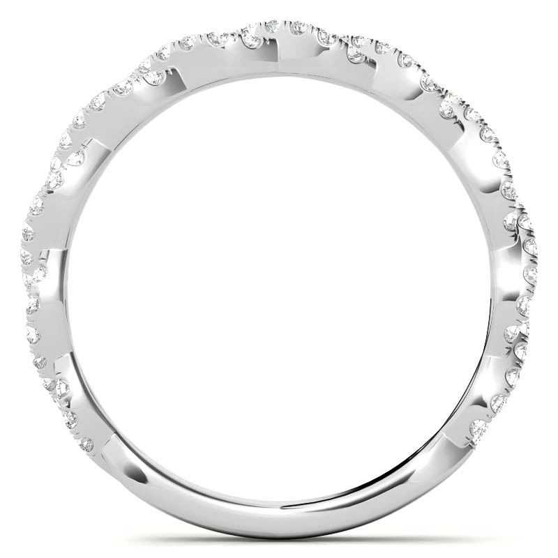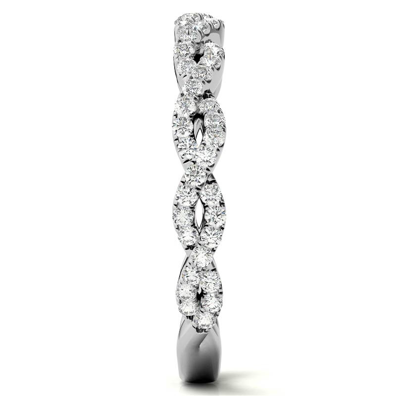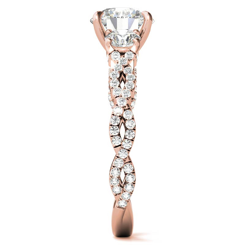 Adorning the infinity-inspired band and delicately adorning the bridge of the gallery are 0.92ct of melee round brilliant Moissanite accent stones, meticulously set to enhance the overall enchantment of the ring.