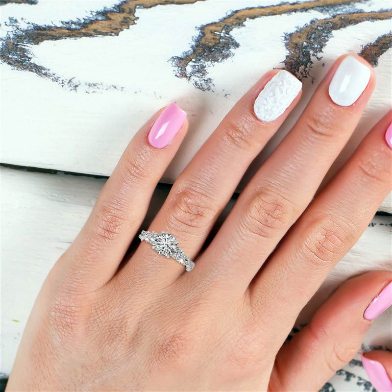 Discover an unexpected delight directly beneath the center stone - a single bezel-set surprise diamond. This exquisite detail, coupled with scroll detailing that exudes an antique aesthetic, adds a touch of vintage charm, further elevating the ring's overall allure.