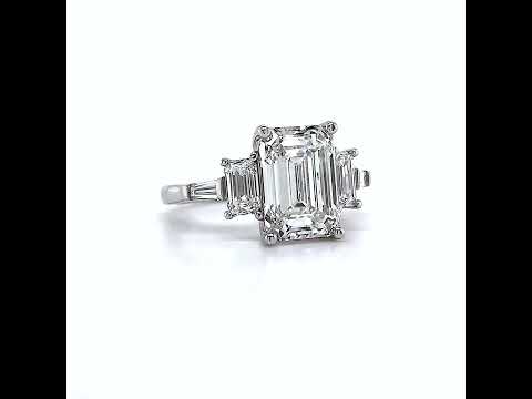The two smaller side stones measuring 5x3mm/0.27ct, each accompanied by two tapered baguette diamond side stones (0.14ct), creating a perfect blend of modern and classic design.