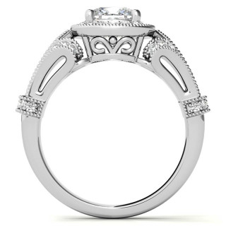 This exquisite Moissanite engagement ring boasts a stunning antique motif with delicate milgrain accents intricately woven throughout the entire design. The unique split shank band design features sparkling round brilliant Moissanites side stones (0.46ct - 0.52ct) that beautifully run up the cathedral and encircle the captivating cushion cut Moissanite center stone.