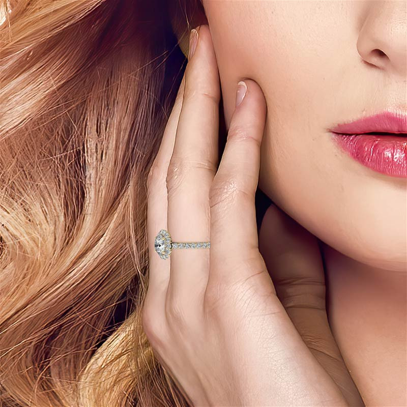 Adding to the allure of this piece are the elegant 2mm/0.03ct Moissanite side stones that beautifully decorate both the bands and halo, with a combined carat weight that ranges between 0.84ct to 1.02ct.