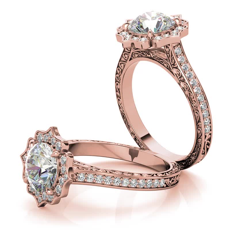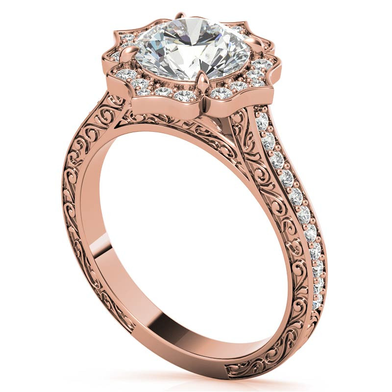 #enr708 Round Floral Halo Antique Engraved Engagement Ring