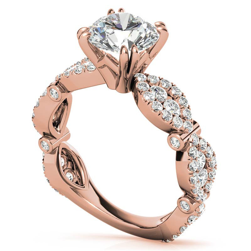 This exquisite engagement ring boasts an antique-inspired design with a beautifully scalloped band that's accented by round accent stones. The band features three scalloped shapes on each side, each adorned with three rows of accent stones for added brilliance. Separating each scalloped portion is a sleek bar, while bezel-set round accent stones on either side of the bar add a touch of elegance to the profile of the ring.