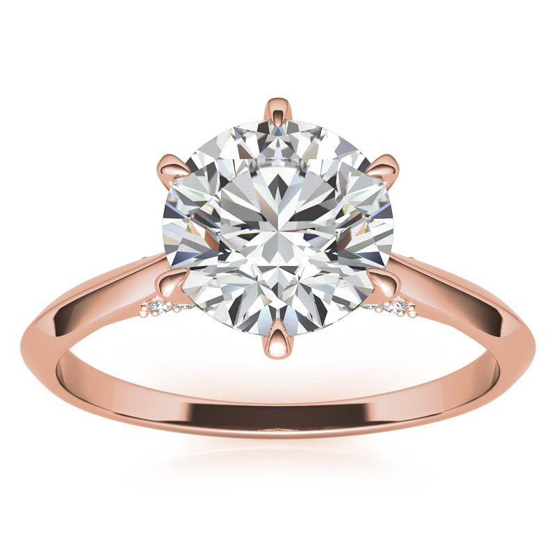 Elevate your engagement with this stunning cathedral ring, showcasing a brilliant round brilliant Moissanite diamond held securely in place by six claw-shaped prongs.