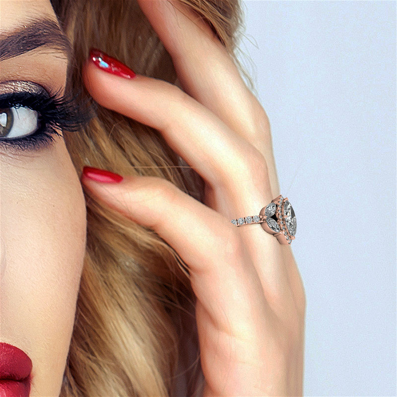 The centerpiece of the ring is a marquise cut Moissanite stone, artfully surrounded by a halo of brilliantly cut round accent stones. Four additional 5x2.5mm/0.14ct marquise cut accent stones are masterfully arranged in a petal formation, adding an extra touch of elegance to the overall design.