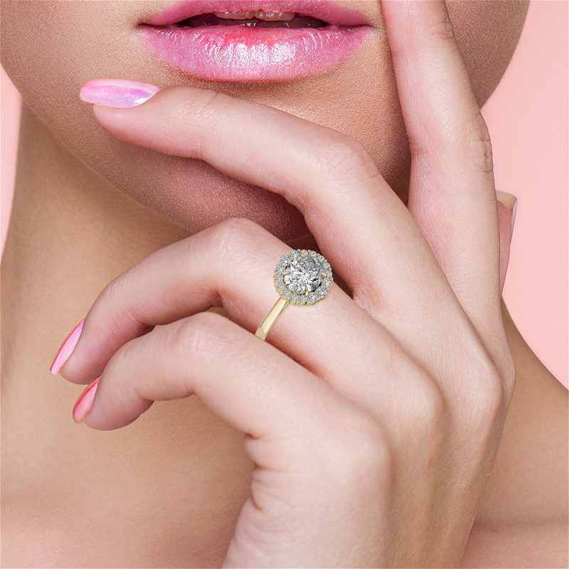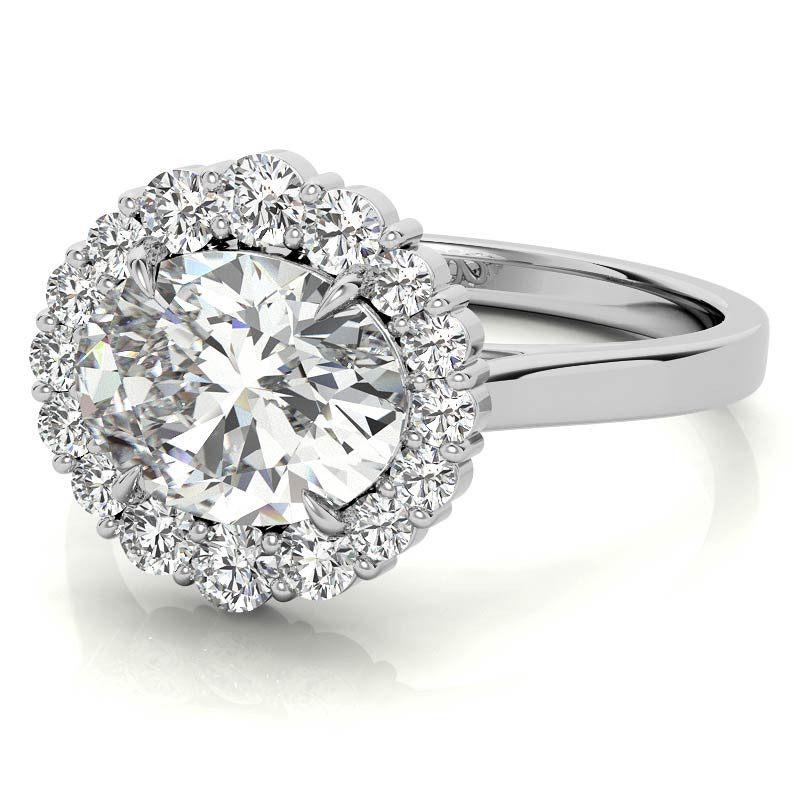 The center stone is complemented by a halo of round brilliant cut Moissanite accent stones (0.21ct - 0.44ct). Delicate petal accents support the base of the center stone, adding to the ring's overall charm and appeal.