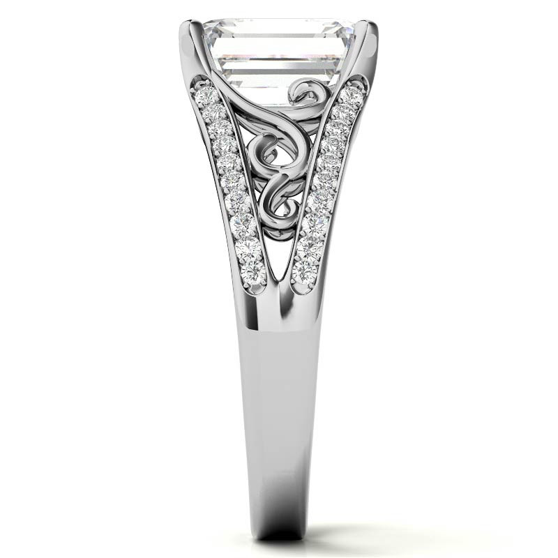 This exquisite cathedral engagement ring is distinguished by its exceptional design. The split shank band is adorned with intricate scroll accents in the gallery that directly accentuate the emerald or radiant cut Moissanite center stone.