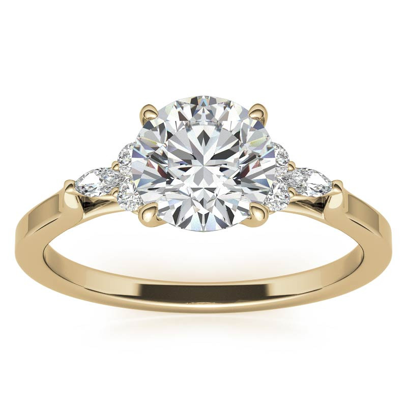 This captivating ring highlights a round brilliant Moissanite center stone and 0.17ct of round and marquise cut colorless Moissanite side stones.
