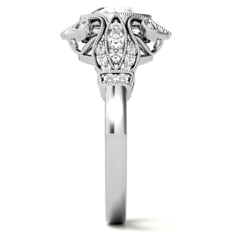 This beautiful Moissanite engagement ring features an antique halo design with a round cut colorless Moissanite center stone and milgrain accents, 0.27ct - 0.35ct of round colorless Moissanite side stones, and is cast in 14k gold, 18k gold or platinum.