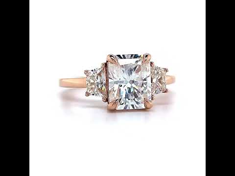 The center stone, available in either an emerald or radiant cut Moissanite, is elegantly secured with four claw shaped prongs. The two trapezoid cut Moissanite side stones, measuring 5.5x3.4mm, perfectly complement the center stone with step-cut faceting for an emerald center stone or brilliant-cut faceting for a radiant center stone.