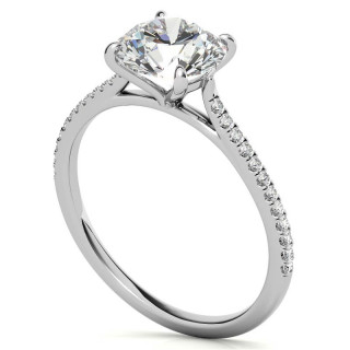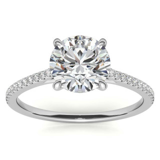 This beautiful Moissanite engagement ring features a four-prong design in a cathedral setting, a round colorless Moissanite center stone, and 0.12ct of colorless brilliant Moissanite side stones. Available in your choice of 14k gold, 18k gold or platinum. The band width is approximately 1.4mm.